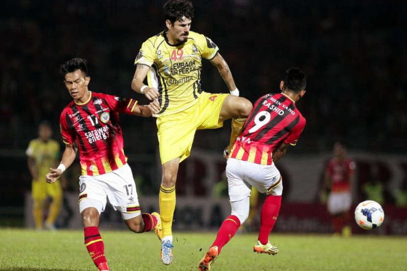 Pemain Perak, Milan Purovic (tengah) diasak oleh dua pemain Sarawak, Mohd Hairol Mokhtar (kiri) dan Mohamad Rashid Aya pada perlawanan Piala Malaysia di Stadium Negeri, Sabtu.