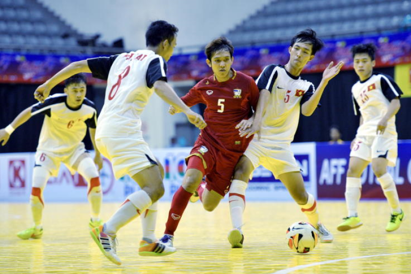Pemain futsal Thailand, Atirat Sittisak (tengah) dikawal ketat oleh pemain dari Vietnam ketika cuba menyerang ke gawang lawan pada Kejohanan Futsal AFF 2014 di Stadium Melawati pada Khamis.