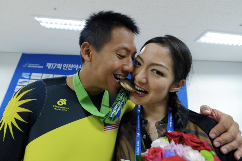 osiah Ng berkongsi kegembiraan bersama isteri Kim Ong Suan Kim selepas meraih pingat gangsa dalam acara akhir keirin lelaki di Incheon International Veledrom pada Khamis.