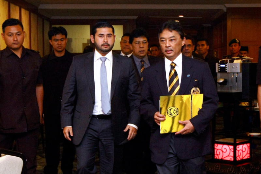 Tengku Abdullah Sultan Ahmad Shah (kanan) bersama Tunku Ismail Sultan Ibrahim (kiri) selepas Mesyuarat Pengurus Pasukan Bola Sepak Negara pada Jumaat.