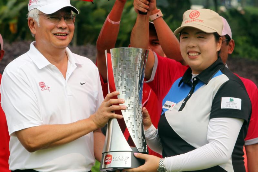 Najib menyampaikan hadiah kejuaraan kepada Feng Shanshan di KLGCC, Ahad.