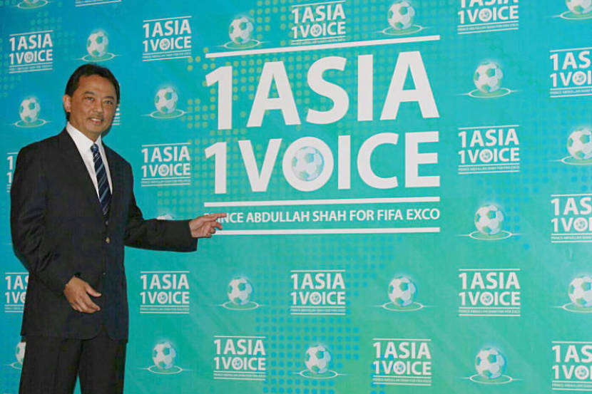 Tengku Abdullah menunjukkan motto 1Asia 1Voice sempena pertandingan merebut kerusi Exco FIFA yang akan diadakan pada April 2015.