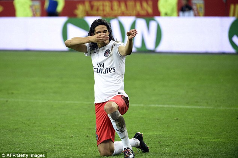 PENYERANG Paris St Germain (PSG), Edinson Cavani dilayangkan kad merah selepas memperagakan aksi sedang menembak apabila berjaya menjaringkan gol ketiga kelab itu pada Jumaat.