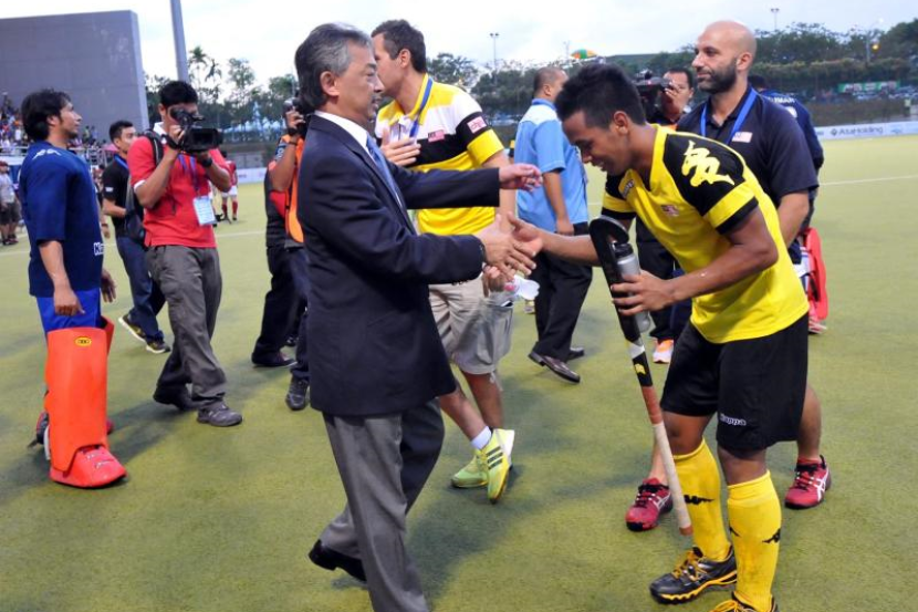 Tengku Abdullah bersama pemain-pemain hoki negara selepas aksi separuh akhir Liga Hoki Dunia tahun lalu.