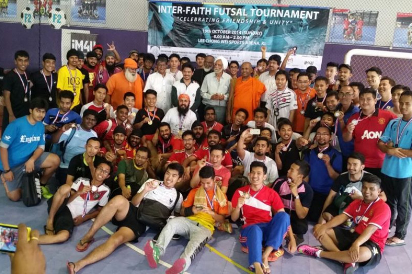Wakil-wakil kumpulan agama Malaysia (barisan pertama berdiri) bergambar bersama sebahagian daripada peserta Kejohanan Futsal FGIS.