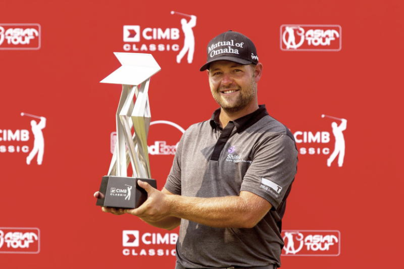 Ryan Moore bergambar bersama piala kemenangan selepas muncul juara pada Kejohanan Golf CIMB Classic 2014. -fotoBERNAMA