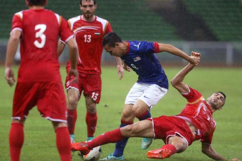 Pemain Malaysia, Norshahrul Idlan Talaha (tengah) bersaingan dengan pemain Syria, Abdul Razak Al Husein (kanan) pada aksi persahabatan antarabangsa di Stadium Shah Alam. -foto GLENN GUAN/The Star