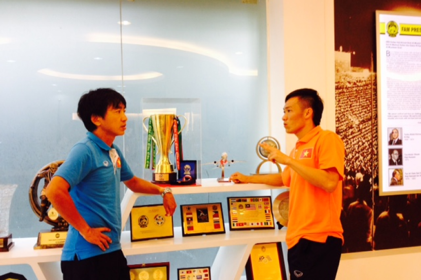 Jurulatih Miura (kiri) bersama kapten pasukan Vietnam sempat memerhati trofi juara Piala AFF Suzuki yang dijulang pasukan Malaysia pada tahun 2010 dipamerkan di Wisma FAM.