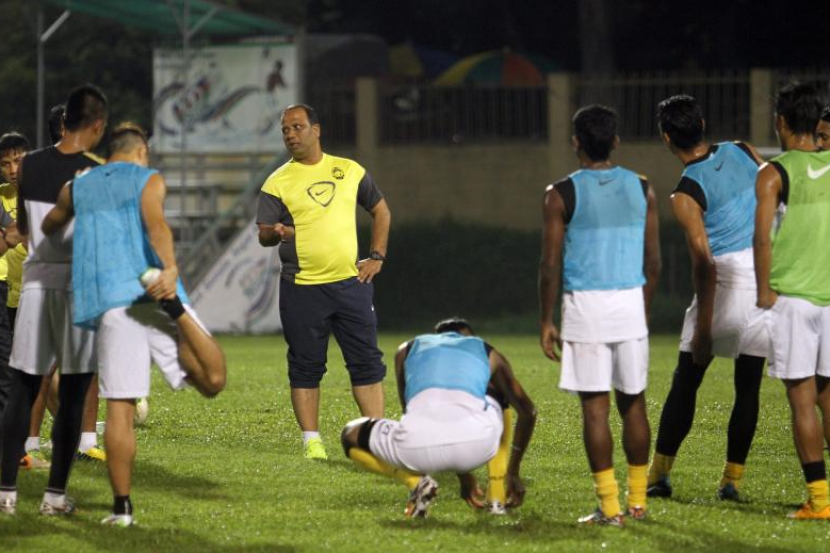 Dollah berbincang dengan pemain-pemain ketika sesi latihan terakhir di FAM sebelum ke Bangkok pada Ahad. Foto: FAIHAN GHANI/The Star