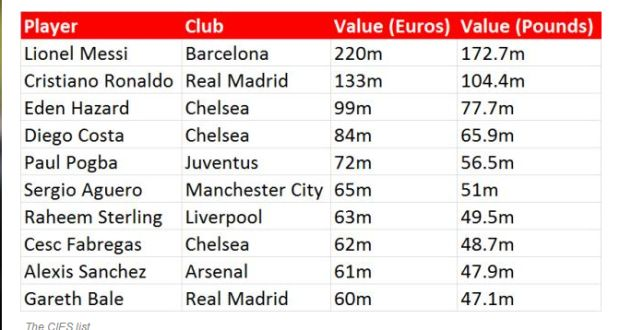 Perangkaan yang dibuat mereka bagi 2015 menarik perhatian apabila Messi dikatakan berharga £172.7 juta (RM929.68 juta) dan pemain bagi pasukan saingannya dari Real Madrid itu hanya bernilai £104.4 juta (RM562.06 juta).
