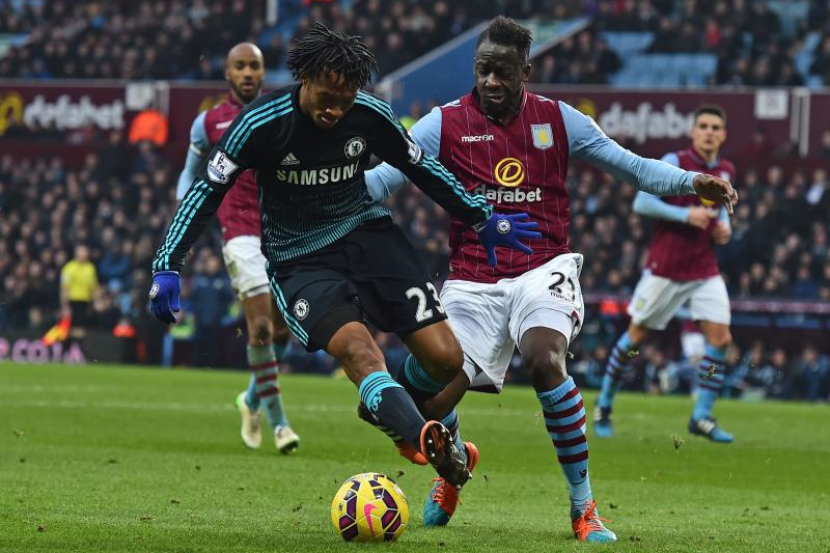 Pemain tengah Chelsea, Juan Cuadrado (kiri) bersaing dengan pemain pertahanan Aston Villa, Aly Cissokho pada aksi perlawanan bola sepak Liga Perdana Inggeris. -AFP