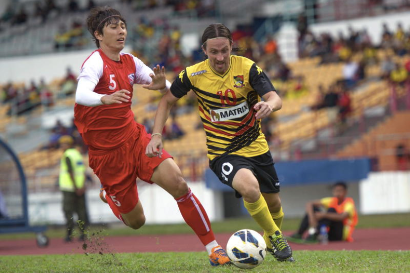 Penyerang Negeri Sembilan, Bruno Sebastian Martelotto mengawal bola sambil diasak oleh pemain KL SPA Putrajaya FC, Kwon Jun (kiri) pada perlawanan Liga Premier di Stadium MBPJ di Petaling Jaya, Jumaat. -fotoBERNAMA