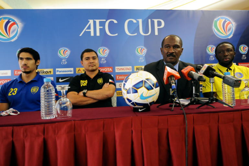 Zainal Abidin Hassan (dua, kanan) menjawab soalan ketika sidang media sebelum perlawanan Piala AFC menentang wakil Filipina Global FC. Turut hadir Penolong Jurulatih Global FC Dan Padernal (dua, kiri), Kapten Pahang Damion Delano Stewart (kanan) dan Kapten Global FC Mark Hartmann. Foto: BERNAMA
