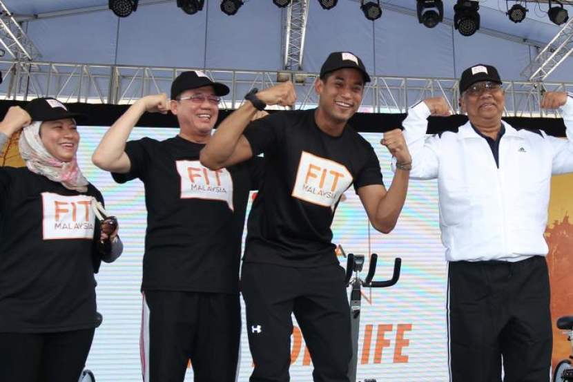 Khairy (ketiga dari kiri) bersama Adenan Satem (kanan) ketika melancarkan Fit Malaysia peringkat negeri di Padang Merdeka, Kuching pada Ahad.