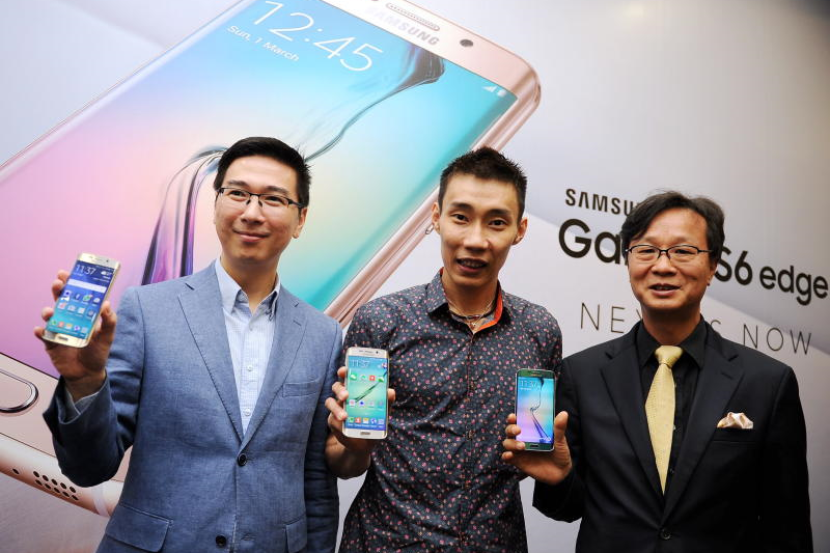 Chong Wei bersama Presiden Samsung Malaysia Electronics Sdn Bhd Lee Sang Hoon (kanan) menunjukkan telefon pintar terbaharu Samsung Galaxy S6 dan S6 Edge pada majlis bertemu pembeli terawal telefon pintar itu pada Jumaat. Turut hadir Naib Presiden Mobile, IT dan Pengimejan Digital Samsung Lee Jui Siang (kiri).Foto: BERNAMA