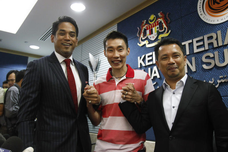 Chong Wei bersama Menteri Belia dan Sukan, Khairy Jamaluddin dan Naib Presiden BAM, Datuk Norza Zakaria pada sidang media berhubung keputusan sesi pendengaran kes dopingnya di Putrajaya, Isnin.