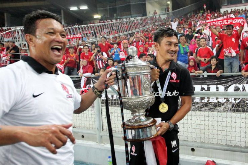 Jurulatih Lions XII Fandi Ahmad (kiri) dan Nasri Nasir menjulang Piala FA yang dimenangi selepas pasukannya menewaskan Kelantan dengan 3-1 pada perlawanan akhir Piala FA di Stadium Nasional Bukit Jalil pada Sabtu malam.