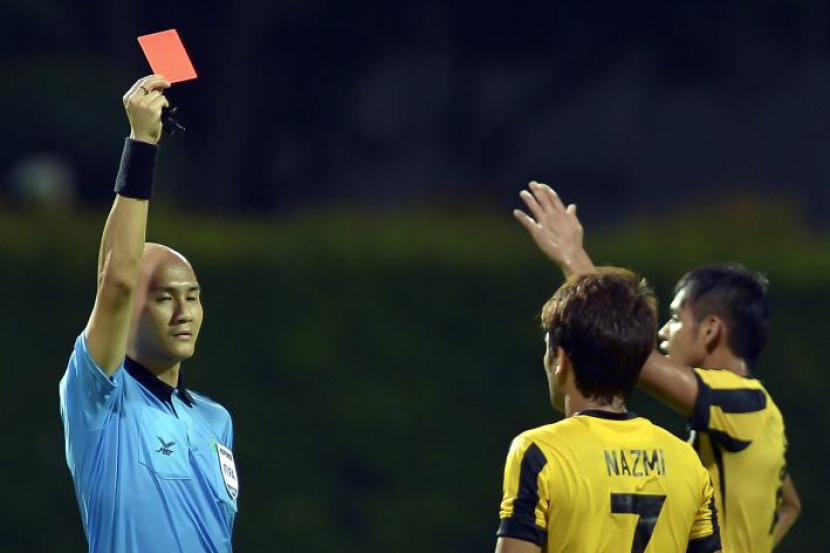 Nazmi Faiz Mansor dibuang padang oleh pengadil, Chuan Hui Foo kerana meludah ke atas Filipe Oliveira. Foto: S.S KANESAN/ The Star