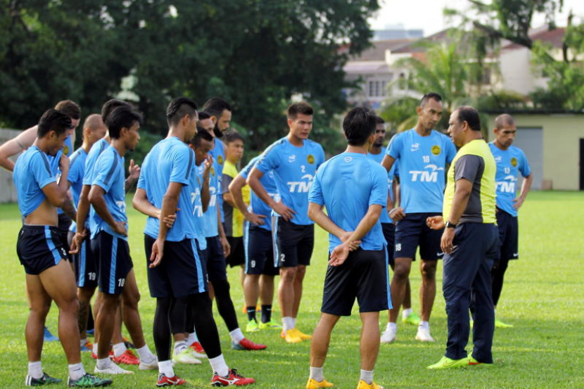Dollah (kanan) bersama pemain-pemain pada sesi latihan skuad negara.