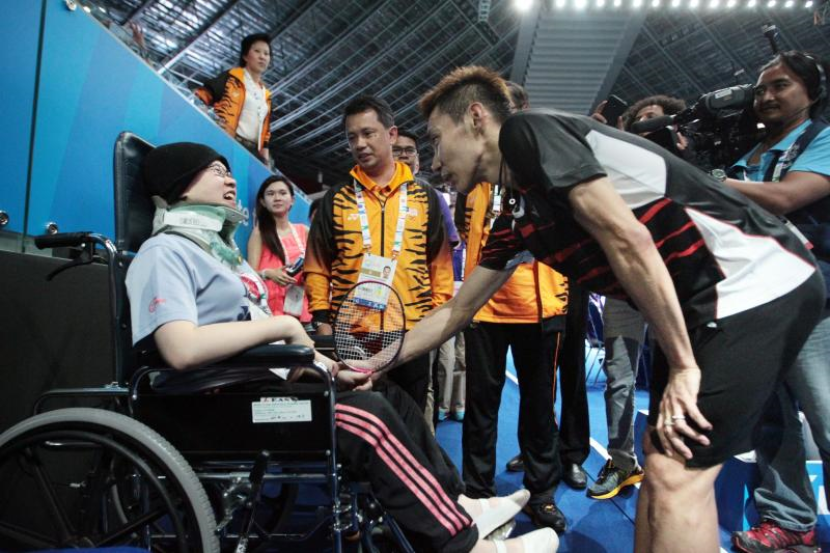 Joven berkerusi roda turut mengambil gambar kenang-kenangan bersama ikon sukan badminton itu.