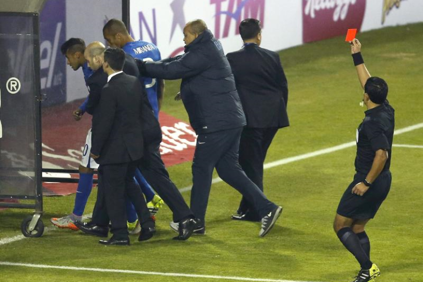 Neymar (kiri) ditenangkan oleh pegawai-pegwawai pasukan Brazil ketika terlibat dengan pergaduhan, manakala pengadil Enrique Osses melayangkan kad merah kepadanya.