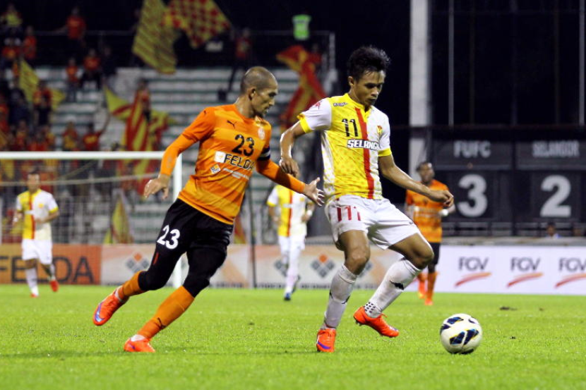 PEMAIN Selangor, Ahmad Hazwan Bakri (kanan) diasak pemain Felda United, Indra Putra Mahayuddin (kiri) dalam perlawanan Liga Super di Stadium Perbandaran Selayang pada Sabtu malam. -fotoBERNAMA