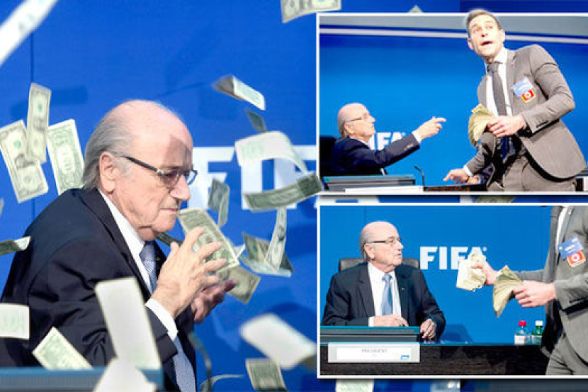 PRESIDEN Fifa, Sepp Blatter berhadapan detik memalukan beberapa minit sebelum memulakan sidang media di Zurich apabila dilemparkan dengan wang kertas.