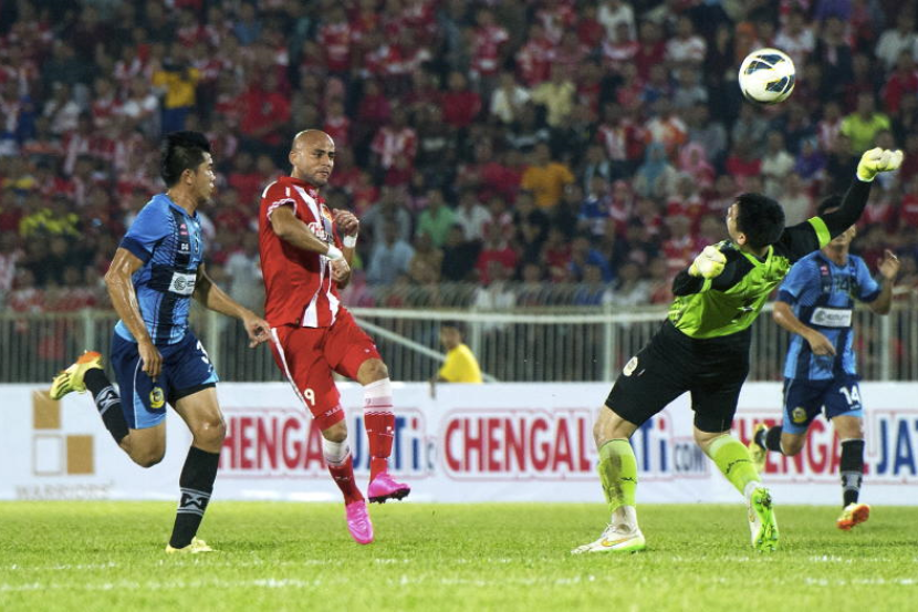 Pemain Kelantan, Erwin Carillo (dua, kiri) membuat tandukan ke arah pintu gol ATM pada Liga Super di Stadium Sultan Muhammad Ke IV yang berlangsung pada Selasa malam.