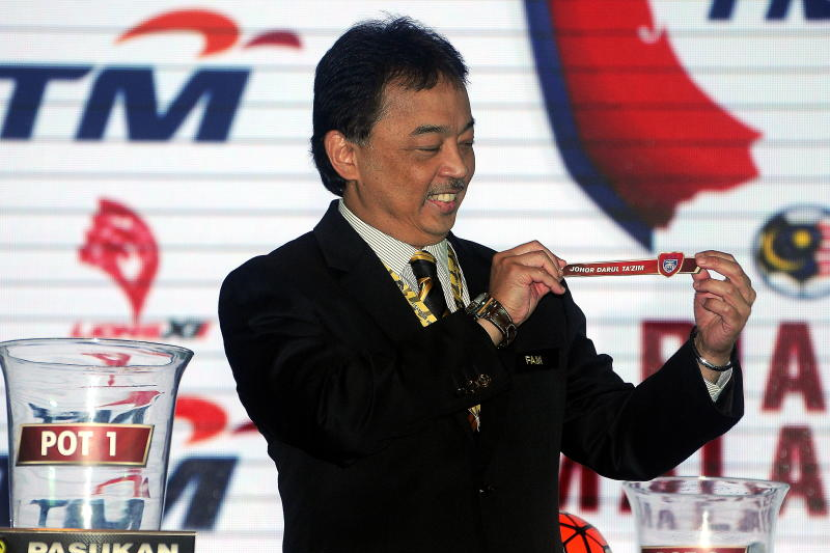 Tengku Abdullah memegang tanda nama pasukan Johor Darul Ta'zim (JDT) yang tersenarai dalam Kumpulan B semasa cabutan undi TM Piala Malaysia 2015, Khamis. Foto Bernama