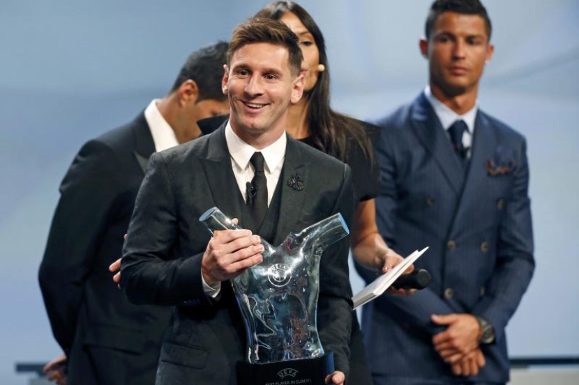 LIONEL Messi menewaskan Cristiano Ronaldo dan Luis Suarez untuk meraih trofi Pemain Terbaik Eropah bagi musim 2014/15.