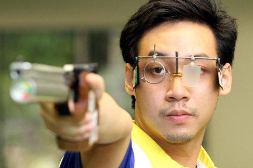 PETALING JAYA: Atlet menembak negara, Johnathan Wong memecah rekod kebangsaan acara 10m Air Pistol individu lelaki pada Kejohanan Menembak Trofi Tun Hanif di Lapang Sasar Subang di sini pada Sabtu.