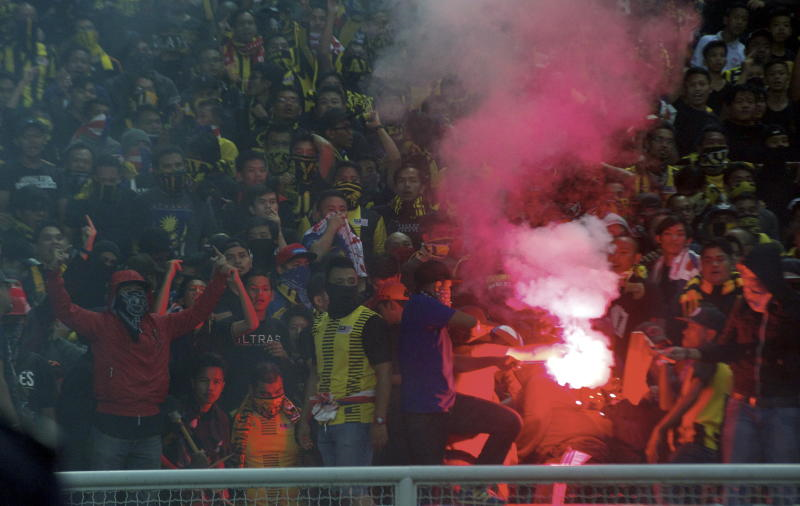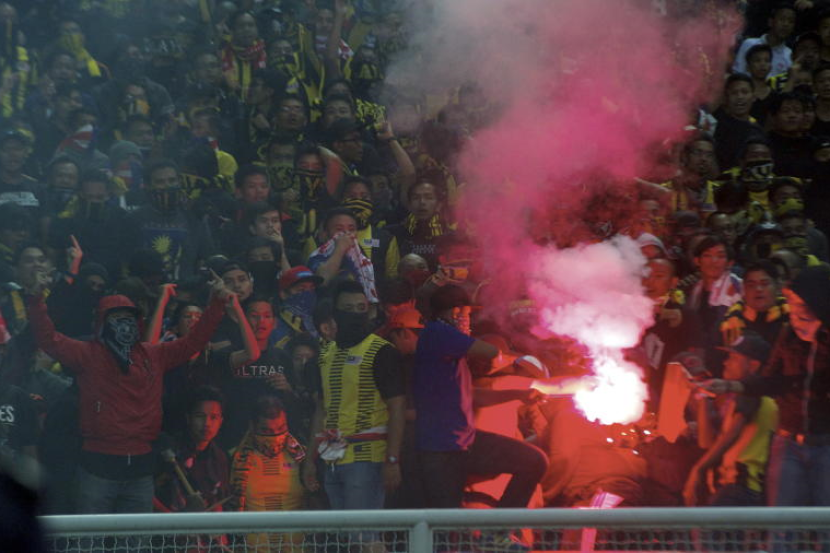 Ultras Malaya membuat kekecohan dengan membaling suar ketika perlawanan bolasepak Kelayakan Piala Asia 2019 di Stadium Shah Alam pada Selasa malam. -fotoBERNAMA