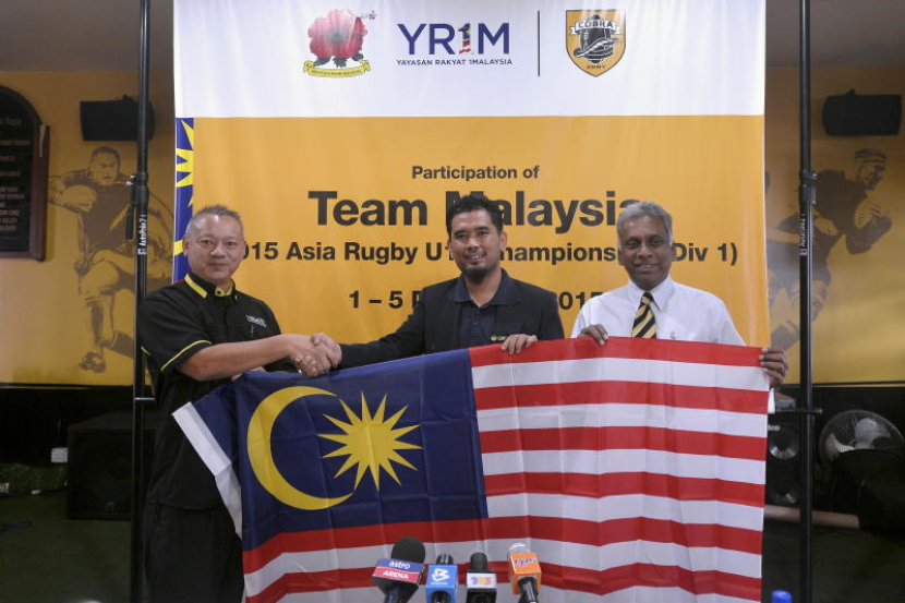 Mohd Mazuri Sallehuddin (tengah) dan Presiden Kelab Ragbi Cobra Tommy Pereira (kanan) menyerah Jalur Gemilang kepada pengurus pasukan Bawah 19 Tahun, Tan Thiam Jin (kiri) selepas mengumumkan akan menyertai Kejohanan Ragbi Asia Division 1 2015 bawah 19 tahun pada sidang media di Kelab Ragbi Cobra pada Isnin.