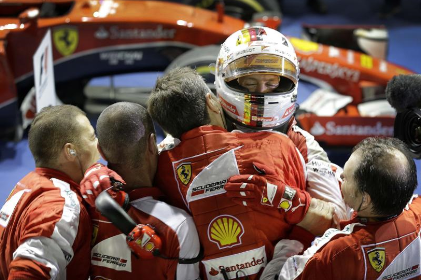 Berikutan kemenangan Vettel di Litar Marina Bay itu, sekumpulan mekanik Ferrari keluar meraikan kejayaan di kawasan larangan yang menjadi tempat jentera berhenti.