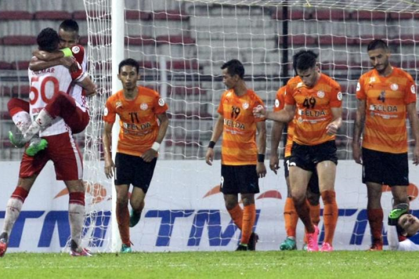 Pemain Kelantan meraikan kejayaan menjaringkan gol ketika menentang Felda United di Selayang pada Sabtu malam. -foto IZZRAFIQ ALIAS/The Star