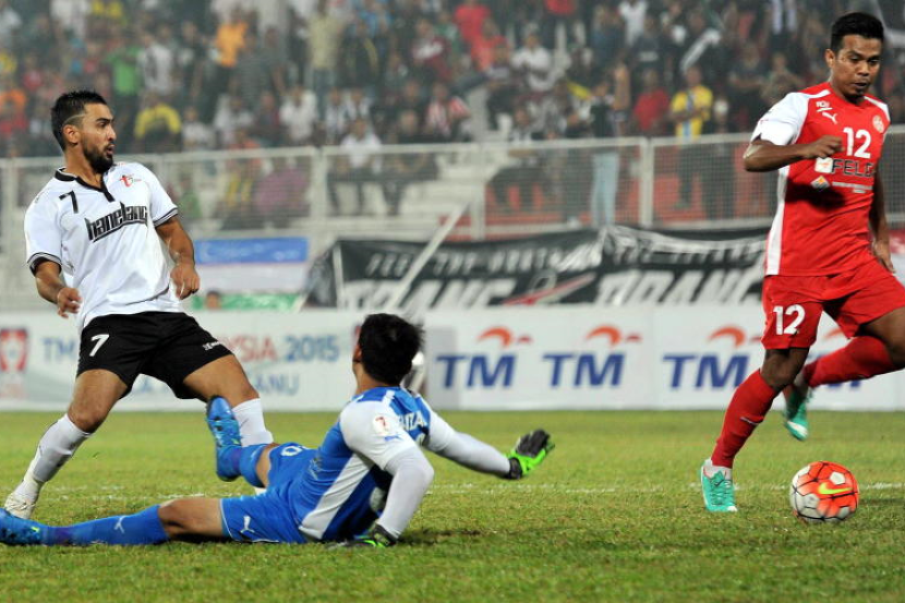 Pemain T-Team Sadriddin Abdullaev (kiri) menewaskan penjaga gol KL Felda United Mohd Farizal Harun untuk menjaringkan gol pertama pasukannya dalam perlawanan Piala Malaysia 3 Oktober lalu. Foto: Bernama