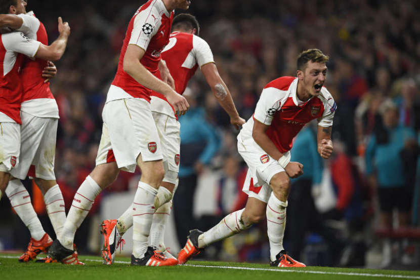 Pemain Arsenal, Mesut Ozil meraikan kejayaannya menjaringkan gol ketika aksi perlawanan menentang Bayern Munich.