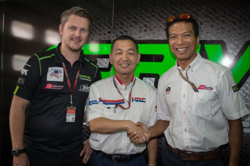 Razlan (kanan) berjabat tangan dengan Naib Presiden Eksekutif HRC, Shuhei Nakamoto. Turut kelihatan pengurus pasukan Drive M7 SIC, Stigefelt (kiri).