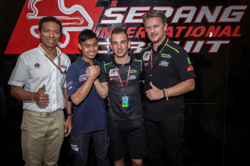 Razlan (kiri) memperkenalkan pelumba baharu pasukan Drive M7 SIC, Adam Norrodin yang akan bergandingan dengan Kornfeil (dua kanan). Turut kelihatan, pengurusan pasukan Johan Stigefelt.