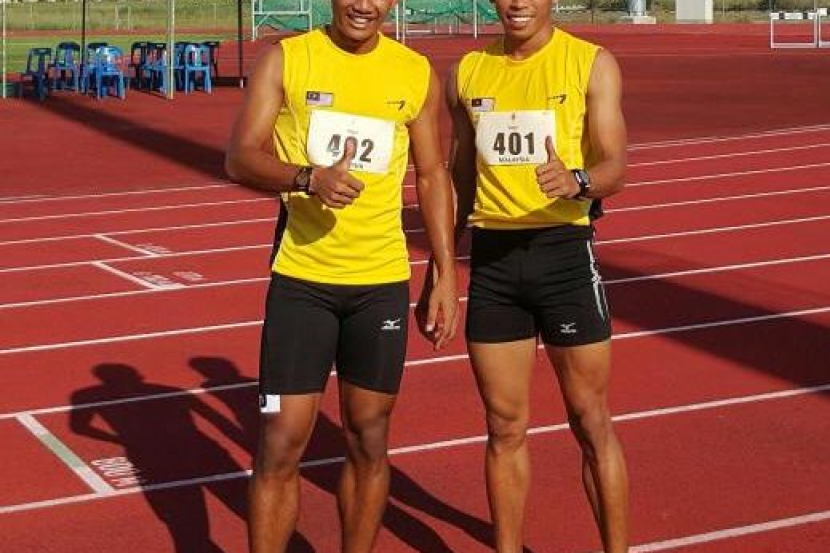 Badrul Hisham (kanan) dan Asnawi Hashim memenangi pingat emas serta perak dalam acara 100m Kejohanan Sukan Sekolah ASEAN di Brunei, Isnin.