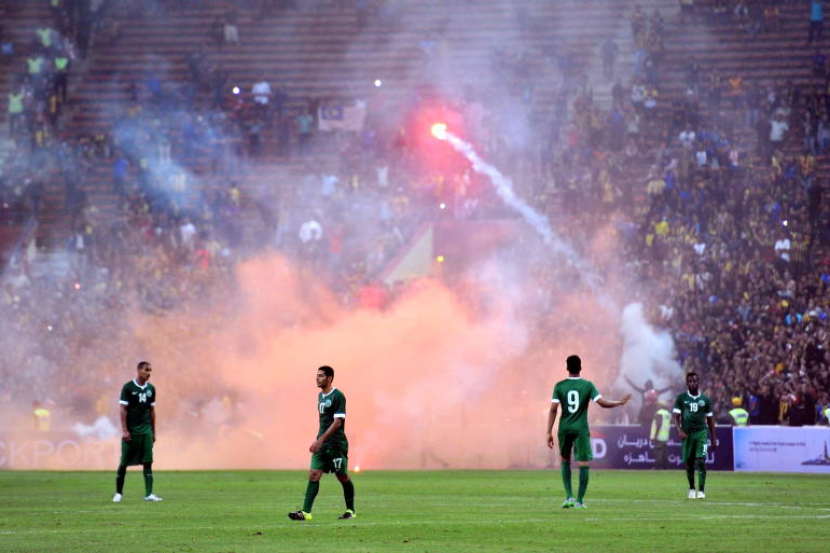 Perlawanan Malaysia menentang Arab Saudi terpaksa dihentikan berikutan penonton melempar suar dan bunga api ke dalam padang.