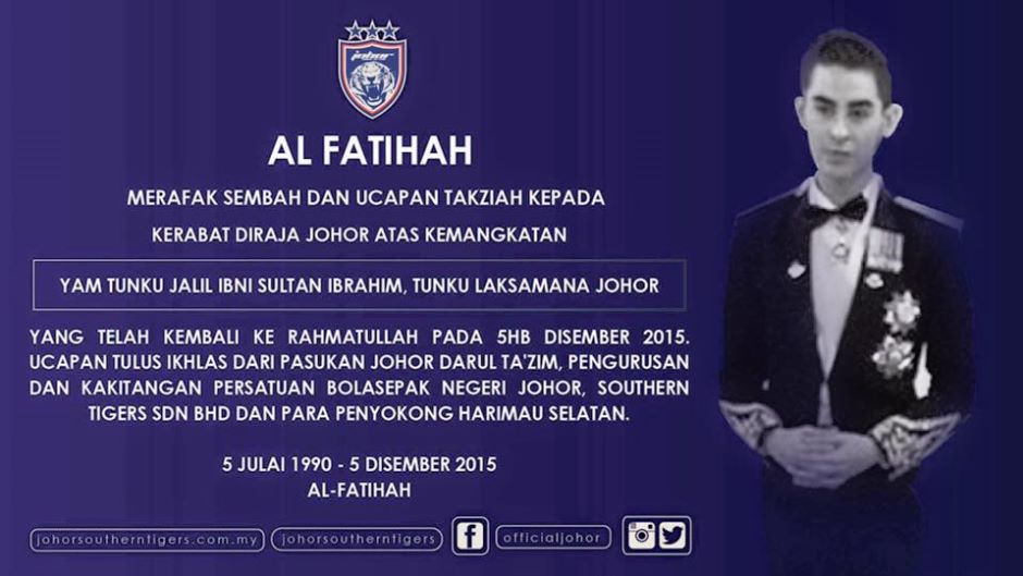 "Ucapan tulus ikhlas dari pasukan Johor Darul Ta'zim, pengurusan dan kakitangan Persatuan Bolasepak Negeri Johor, Southern Tigers Sdn Bhd dan para penyokong Harimau Selatan. Al-Fatihah".