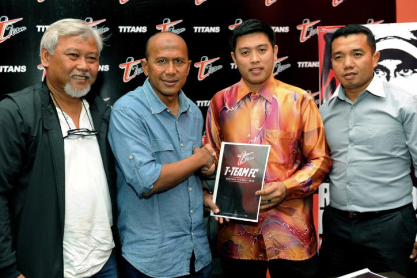 Rahmat Dermawan (dua, kiri) menyerahkan dokumen kontrak sebagai jurulatih pasukan T-team kepada Ketua Pegawai Operasi T-Team Shahrizan Mohd Zain (dua, kanan) selepas menandatangani kontrak di pejabat pengurusan pasukan T-Team pada 3 Disember lalu. Foto: Bernama