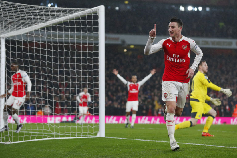 Pemain Arsenal, Laurent Koscielny meraikan kejayaan selepas menjaringkan gol ketika pasukannya menentang Newcastle United.