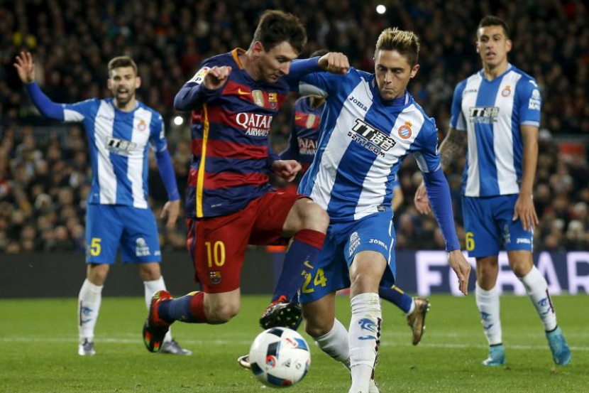 Aksi pemain Barcelona, Lionel Messi (kiri) ketika pasukannya menentang Espanyol.