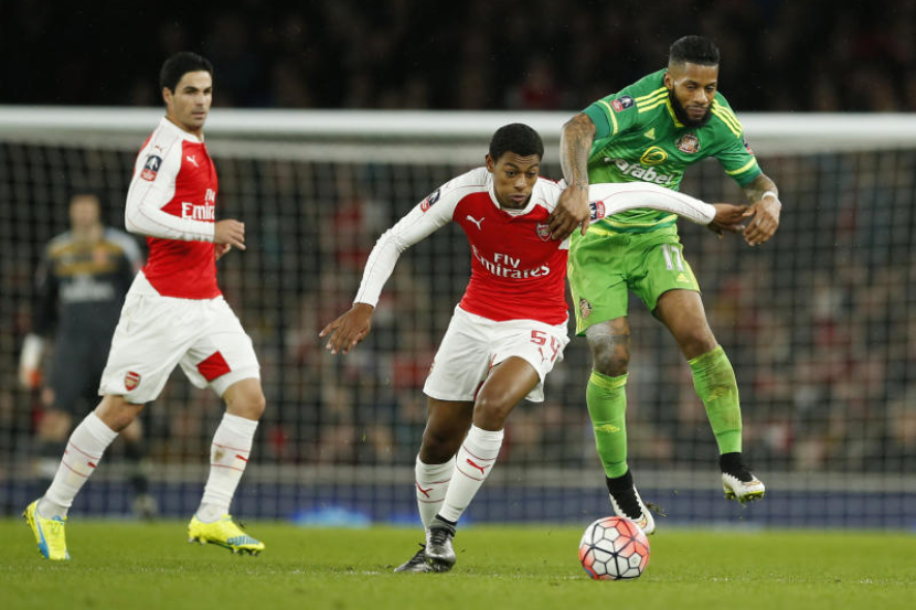 Pemain Arsenal, Jeff Reine Adelaide bersaing dengan pemain Sunderland, Jeremain Len pada aksi perlawanan Piala FA Inggeris.