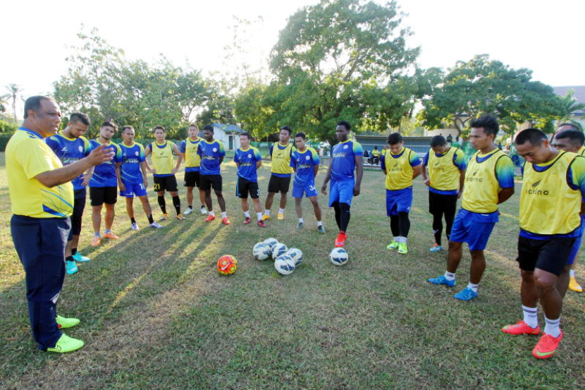 Dollah (kiri) sedang memberi panduan tertentu semasa giat melatih pemain pasukan negeri sebagai persediaan menghadapi saingan Liga Perdana 2016 di perkarangan kompleks sukan Tuanku Syed Putra. Foto: Bernama