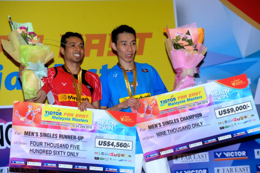 Chong Wei (kanan) muncul juara Kejohanan Badminton GP Emas Masters Malaysia untuk kategori perseorangan lelaki selepas menewaskan rakan senegara, Iskandar Zulkarnain Zainuddin (kiri). Foto: Bernama