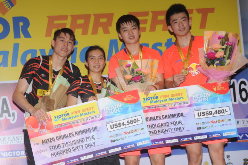 Pasangan bergu campuran negara Tan Kian Meng dan Lai Pei Jing (kiri) terpaksa berpuas hati sebagai naib juara selepas tewas kepada pasangan dari China Zheng Siwei dan Li Yinhui (kanan) dalam perlawanan akhir bergu campuran pada Kejohanan Badminton GP Emas Masters Malaysia yang berlangsung di Spices Arena pada Ahad. Foto: Bernama