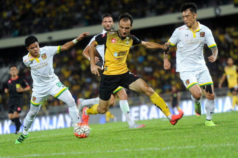 Pemain Perak, Vokhid Shodiev diasak tiga pemain Kedah pada perlawanan Liga Super di Stadium Perak Sabtu malam. Foto: Bernama